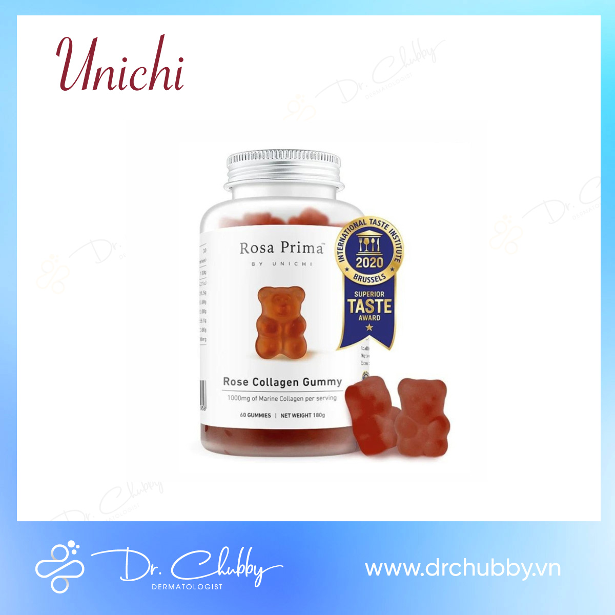 Kẹo collagen Unichi Rose Collagen Gummy đến từ thương hiệu Unichi có dạng kẹo dẻo dễ ăn giúp bổ sung collagen để nuôi dưỡng làn da từ sâu bên trong, giúp làn da trắng sáng, săn chắc. Unichi Rose Collagen Gummy là một loại bổ sung collagen đột phá trong lĩnh vực làm đẹp, chứa cánh hoa hồng tự nhiên, nụ tầm xuân và Marine Collagen giúp cải thiện quá trình chăm sóc da và mang lại cho làn da sự trẻ trung và rạng rỡ. Được đóng gói với chất lượng collagen tốt nhất và các thành phần cao cấp nhất, những viên kẹo dẻo Unichi Rose Collagen Gummy mang đến sự tiện lợi và ngon miệng với hương vị hoa hồng và nụ tầm xuân đặc trưng.
